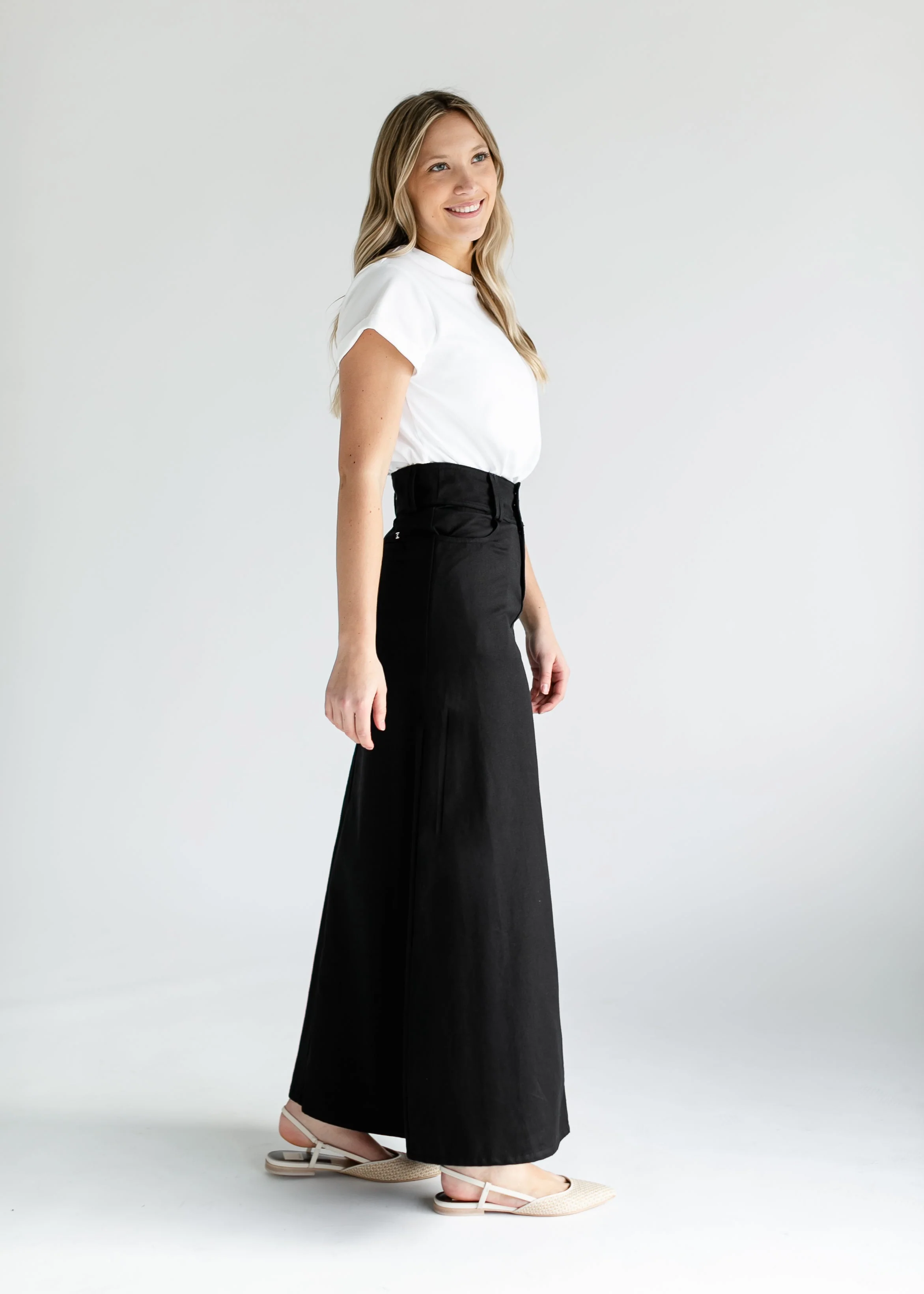 Camellia A-Line Cotton Twill Maxi Skirt is a quality basic essential skirt for all the tall girls! Designed with no slit, an a-line silhouette, and comfortable beautiful fit! There is a three button closure at the waist, side pockets, and double belt loops perfect for adding a belt!
