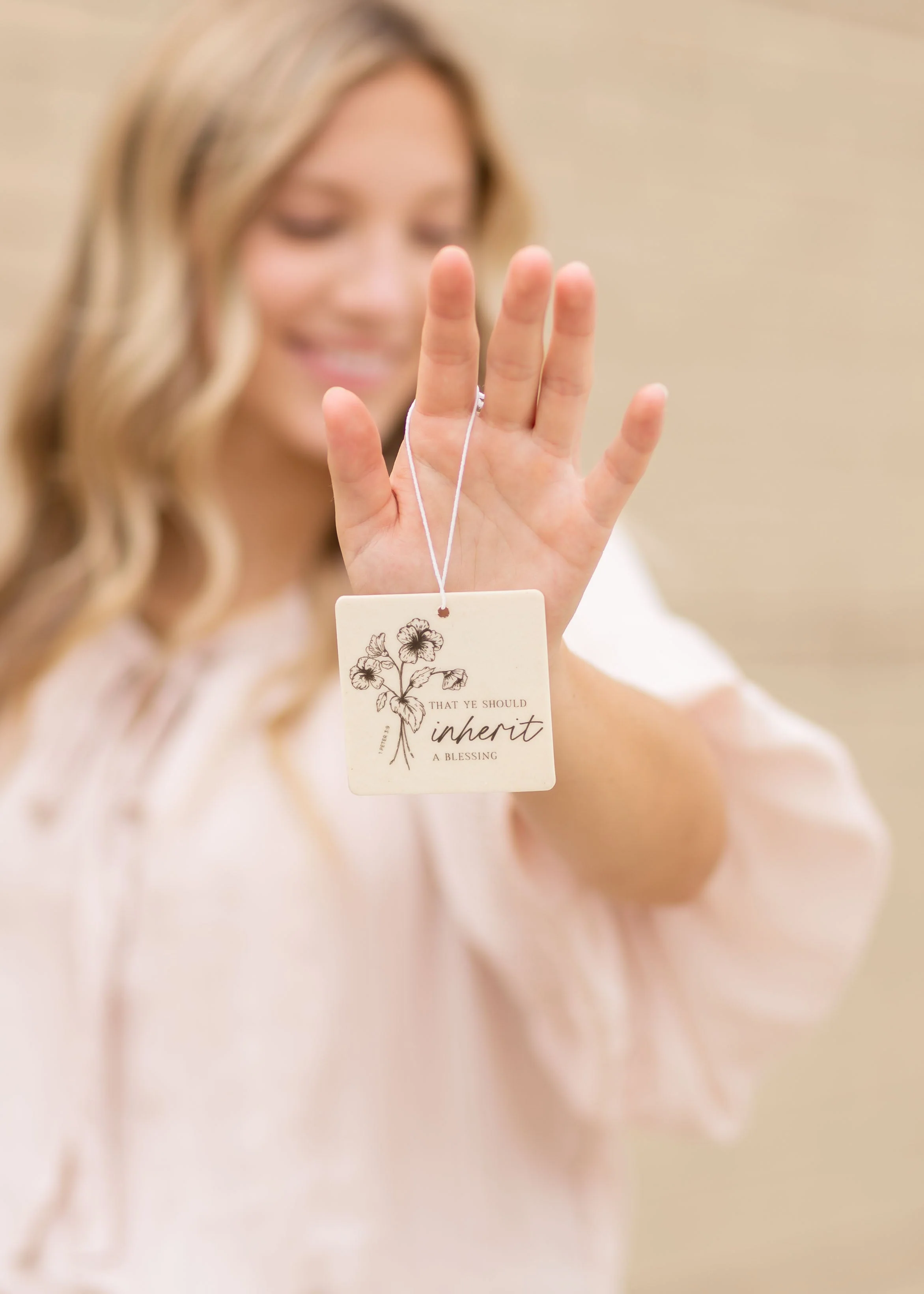 Hang the Inherit Air Freshener in your vehicle or around your house for a fresh scent all day long. Adorned with a hand drawn flower design and a KJV bible verse that reads "That ye should inherit a blessing" 1 Peter 3:9. A wonderful reminder and so beautiful.