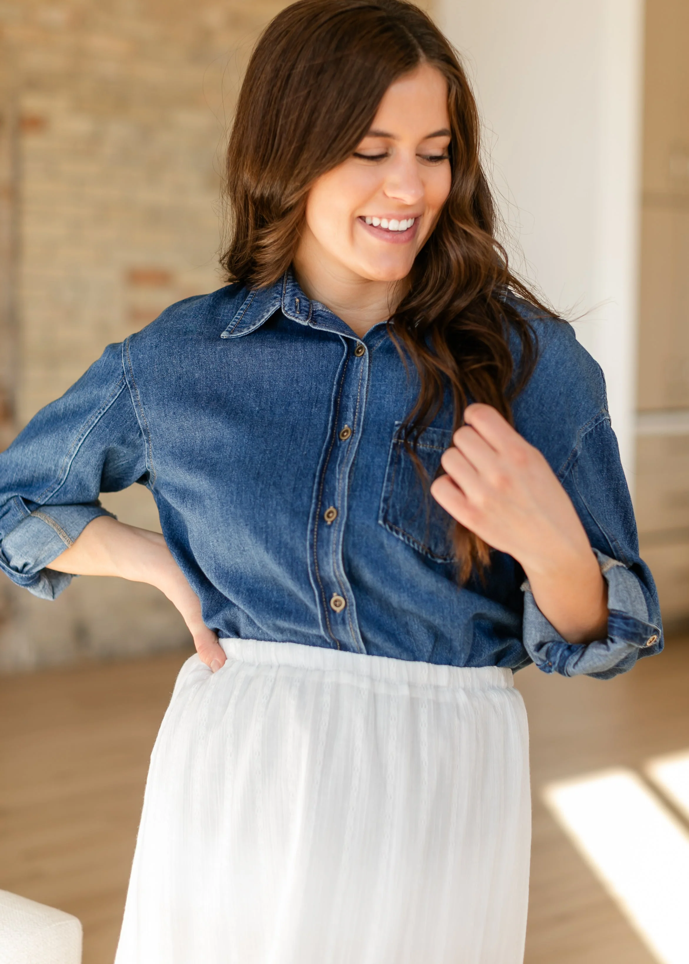 Elevate your wardrobe with the Leighton Linen Blend Denim Long Sleeve Top by KUT! This versatile long-sleeve button-up shirt crafted from a breathable cotton and linen blend. Designed for effortless comfort across all seasons, its relaxed fit ensures easy layering and a laid-back yet polished look. Perfect for pairing with your favorite skirts or pants, this shirt transitions seamlessly from casual to chic, making it a must-have staple for year-round style!